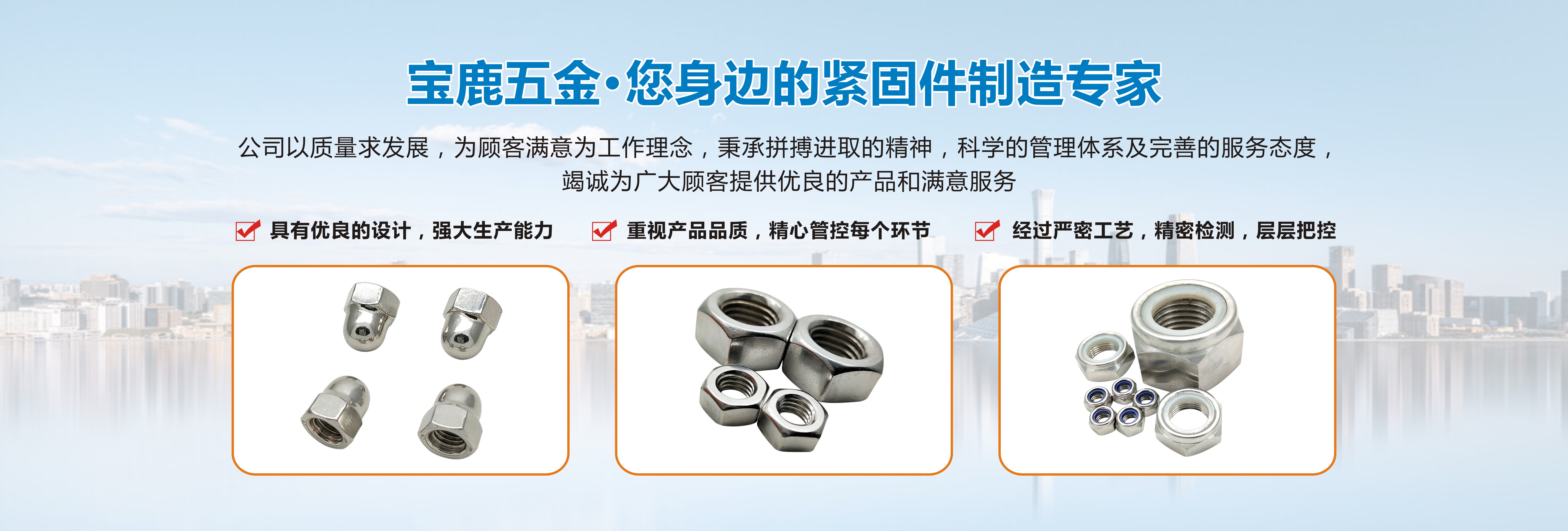 東莞市寶鹿五金有限公司是以生產、銷售不銹鋼緊固件的專業企業。產品標準有: 國標、美標、英標、德標、日標等。主要產品有:不銹鋼外六角、杯頭內六角、平頭內六角、圓頭內六角、機米螺絲、盤頭機螺絲、沉頭機螺絲、盤頭自攻螺絲、沉頭自攻螺絲、 大扁頭機螺釘、大扁頭自攻螺絲、馬車螺絲以及各種螺母、平墊、彈墊、各種擋圈、介子。生產加工非標各種材質超長超大螺母、螺桿,304, 31 6化學錨栓等非標加工,防松螺絲定制與加工,精密CNC加工,數控車床加工件,不銹鋼303,銅,鋁,鐵,塑膠等車件。